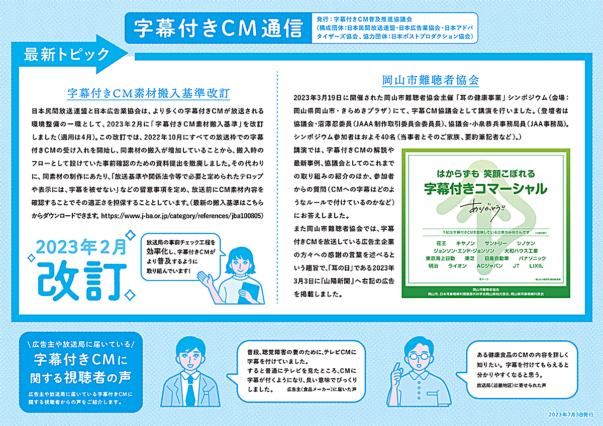 (記事抜粋) 難聴者に正確な情報を伝えられる字幕付きコマーシャルに期待する岡山市難聴者協会 (川場 充・妹尾 克己)