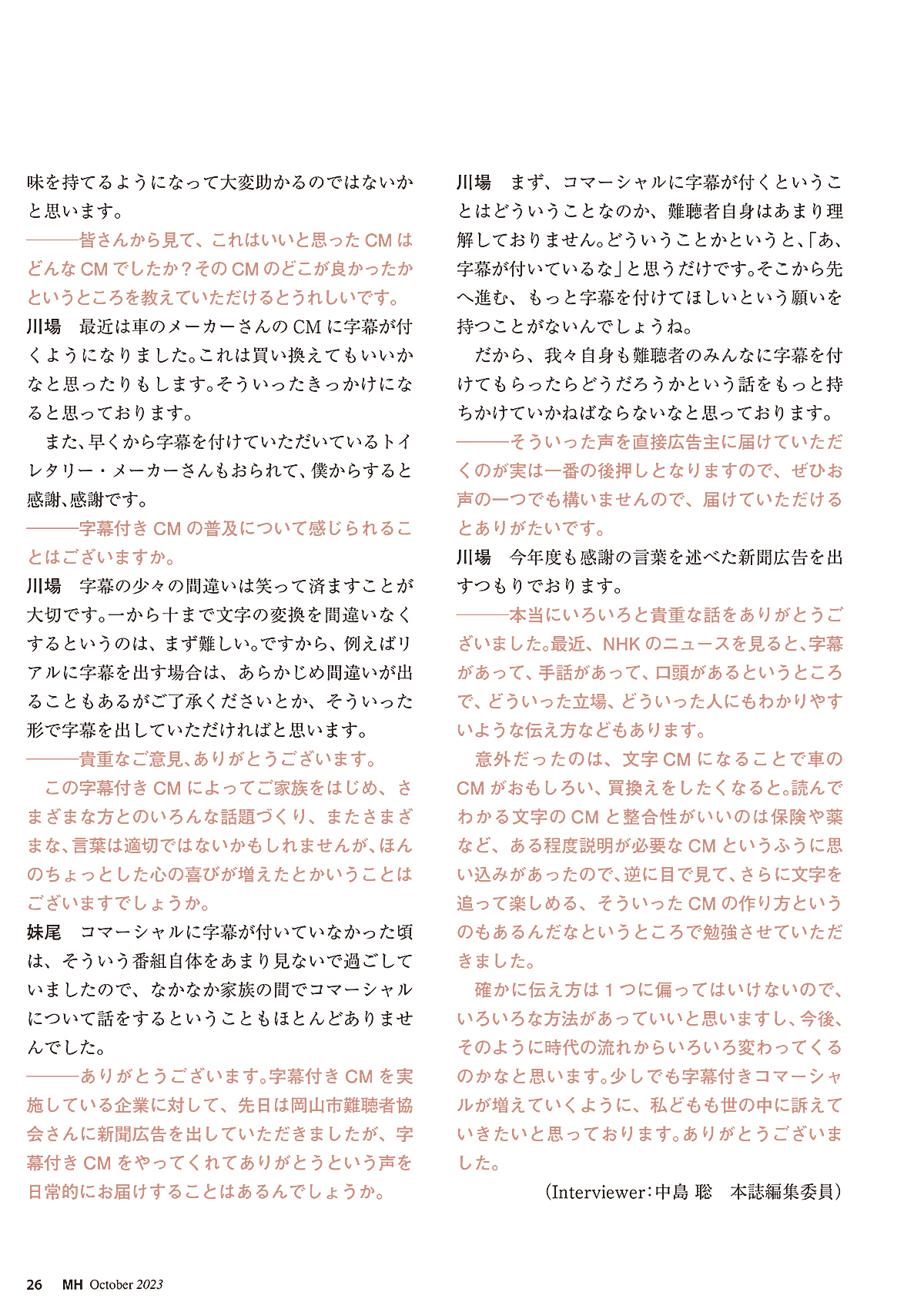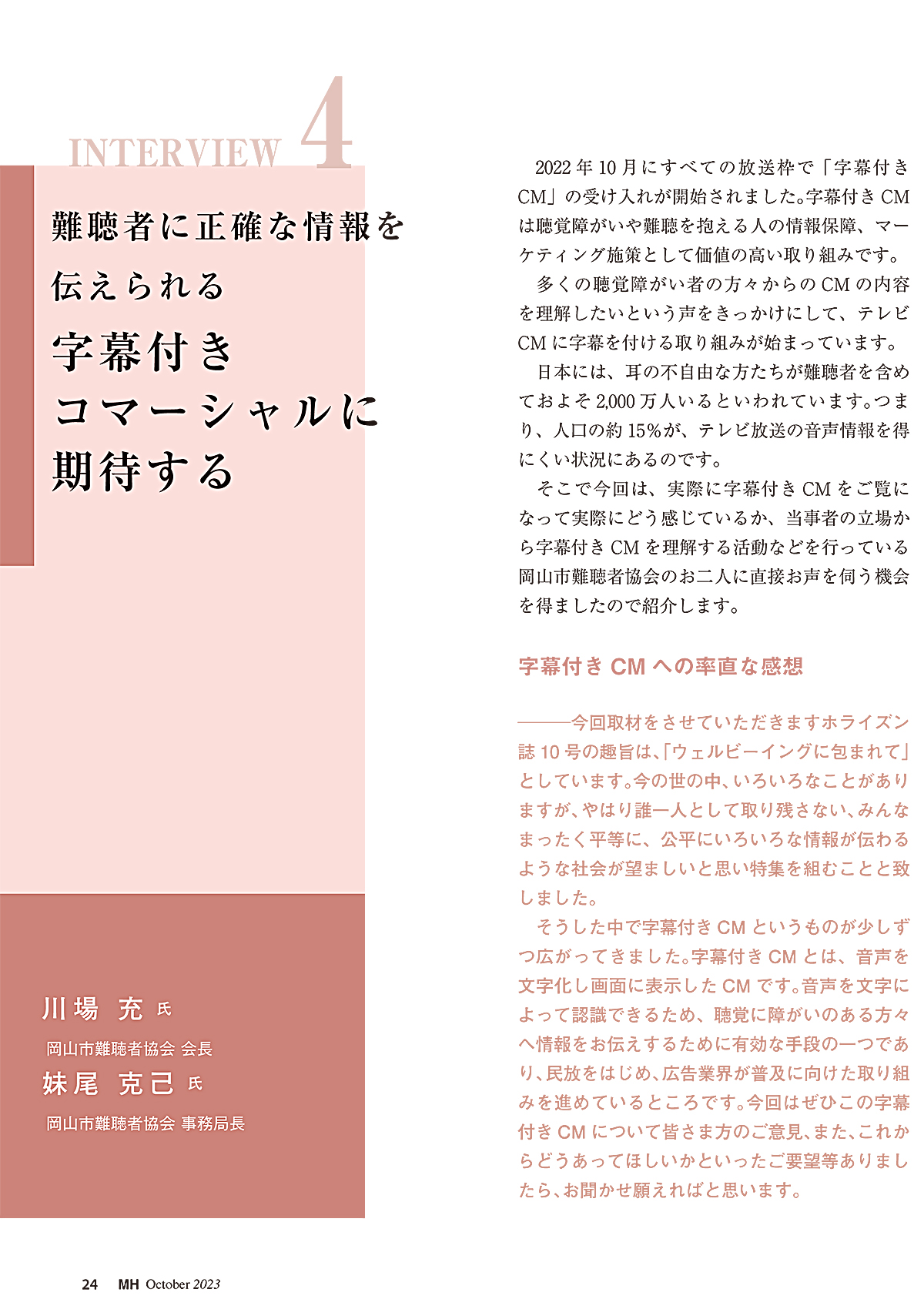 (記事抜粋) 難聴者に正確な情報を伝えられる 字幕付きコマーシャルに期待する 岡山市難聴者協会 (川場 充・妹尾 克己)